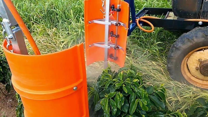 Ato rendimento produtivo: Graças ao sistema de pêndulo existente no conjunto de aplicação do KIT DE PULVERIZAÇÃO PARA CAFÉ NOVO SMART COFFEE, mesmo que o trator esteja em um nível ou inclinação e a planta em outro, este mecanismo garante o acompanhamento esquadrejado à planta, isso resulta que a pulverização atinja eficientemente seu alvo.